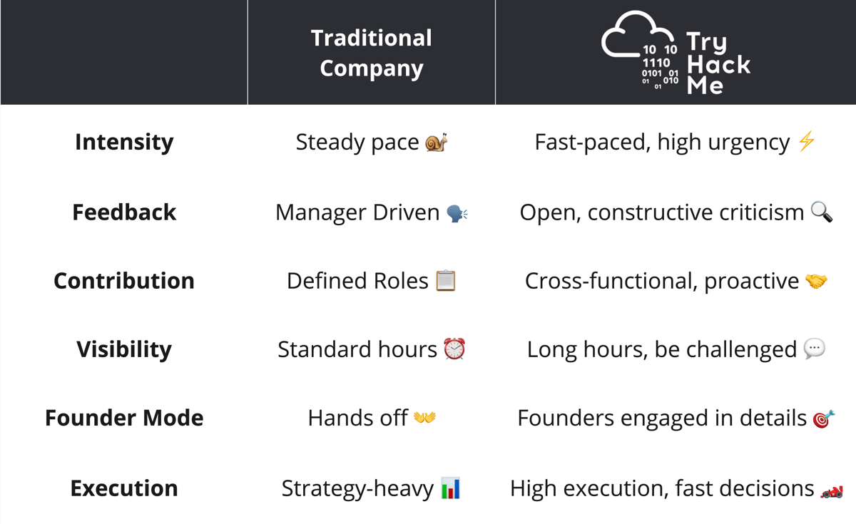 TryHackMe isn’t your typical workplace. We’re intense, ambitious, and built for people who thrive on challenges. I want candidates to read this and say either, “TryHackMe isn’t for me” (that’s good; it’s not for everyone) or, “This sounds exactly like the environment I want to operate in.”